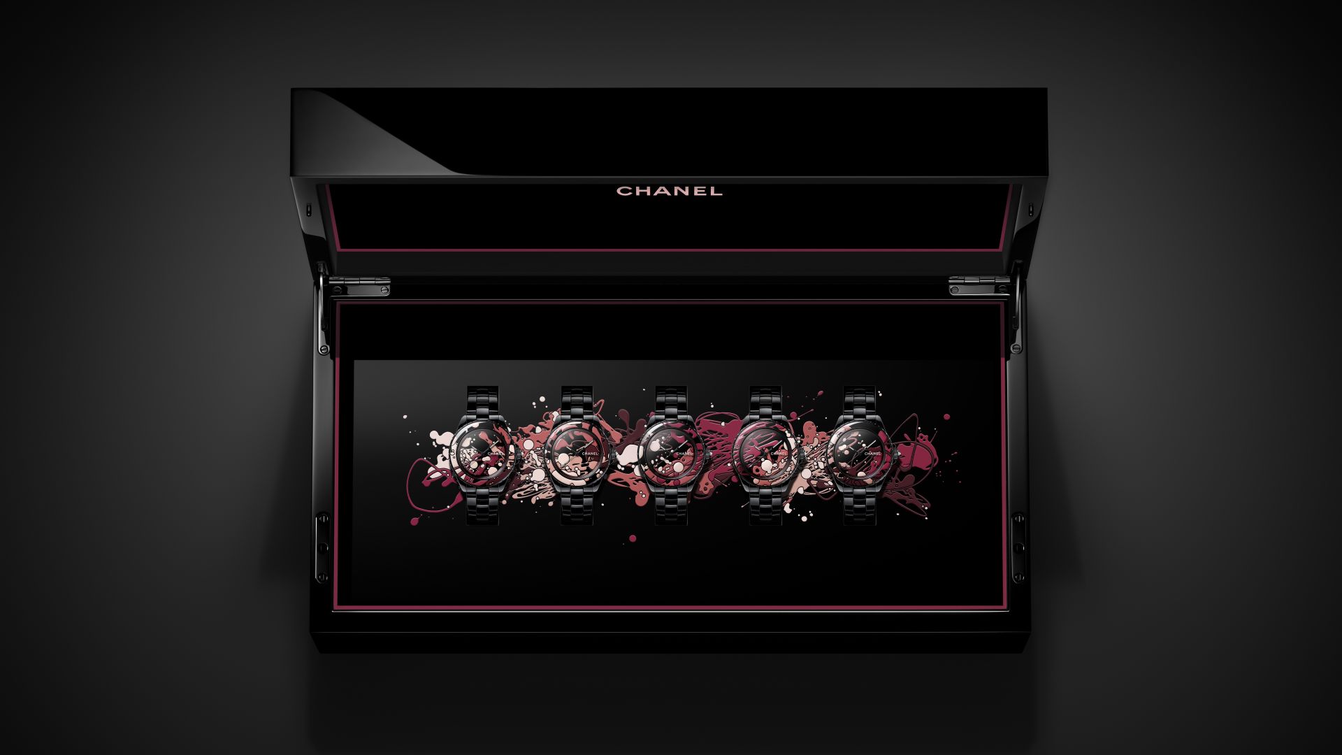 Finally, the J12 Box “Dripping Art” presents a set of five black J12 models in 38 mm, each decorated with dripping enamel in shades graduating from pink to red. To achieve this effect, Chanel developed a new process allowing enamel to adhere precisely to the ceramic dials and bezel inserts. The five watches are housed together in a lacquered black wooden box, painted with drip motifs that link them into a single work of art. Only five of these J12 Box “Dripping Art” sets will be produced.