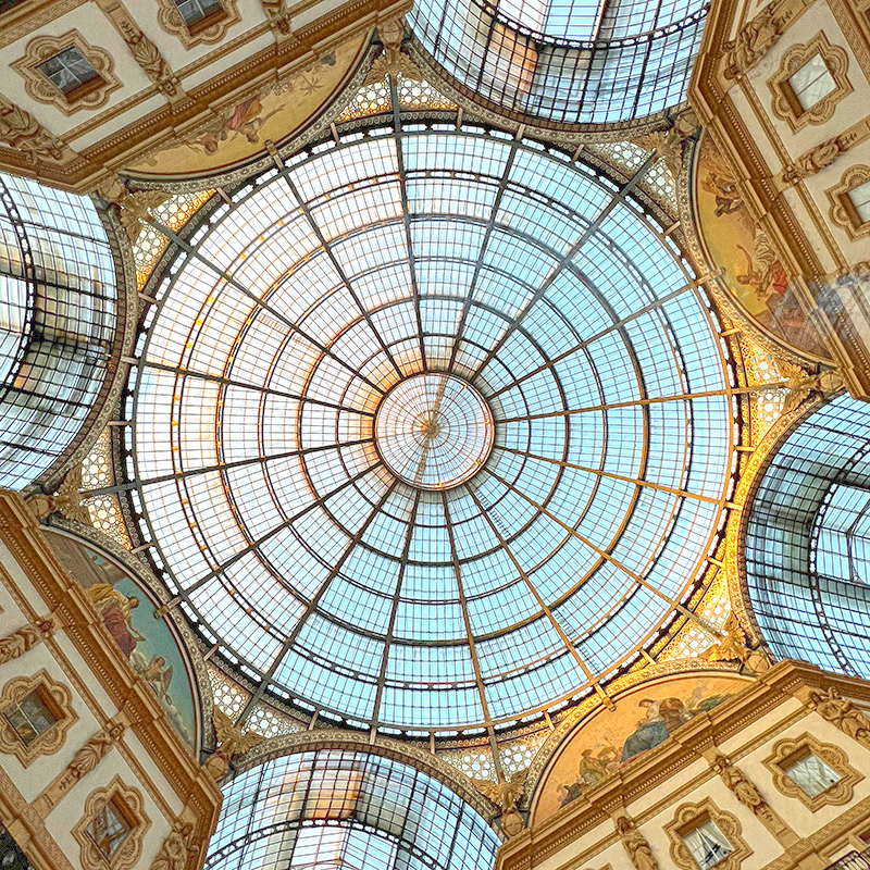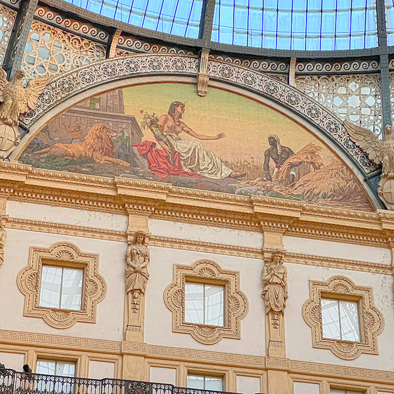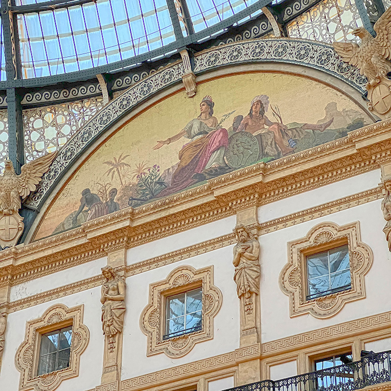 หลังจากที่เห็นภาพ Galleria Vittorio Emanuele II มานับครั้งไม่ถ้วน ผมก็ได้ทำตัวเป็นนักท่องเที่ยวอย่างสมบูรณ์แบบด้วยการมาเยือนช้อปปิ้งอาร์เคดที่เก่าแก่ที่สุดของมิลานแห่งนี้ซึ่งเปิดให้บริการมา 147 ปีแล้วตั้งแต่ปี ค.ศ. 1877 เมื่อทุกคนเดินเข้ามาถึงตรงกลางก็จะพบกับลานรูปทรงแปดเหลี่ยมอยู่ใต้โดมกระจก และมีคนจำนวนมากไปยืนล้อมโมเสกรูปวัวบนพื้นที่มีความเชื่อกันว่าเมื่อเหยียบตรงนั้นของน้องแล้วหมุน 3 รอบจะโชคดี เรื่องนี้ผมเคยอ่านเจอก่อนไปถึงแม้ว่าจะไม่ได้สนใจอะไร แต่สิ่งที่ได้ไปรู้ตอนอยู่ที่มิลานแล้วคือหากเราแหงนหน้าขึ้นไปดูข้างบนจะพบว่าหน้าบันของแต่ละอาคารภายใน Galleria Vittorio Emanuele II มีรูปโมเสกที่บอกเล่าถึงทวีปหลัก 4 ทวีปของโลกตามมุมมองของคนในสมัยก่อน ได้แก่ ยุโรป อเมริกา แอฟริกาและเอเชีย ถ้าถามว่าเป็นเรื่องที่มีประโยชน์อะไรกับชีวิตไหมก็ต้องตอบว่าไม่ แต่ก็ขอจัดให้อยู่ในข่าย “ประดับความรู้” ก็แล้วกัน