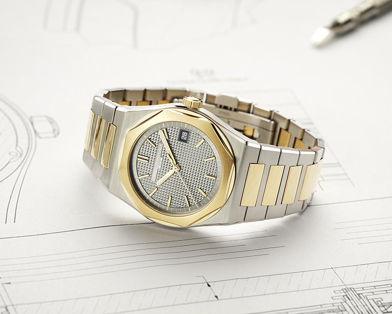 And now I reveal to you the Laureato Fifty. This Laureato really pays tribute to where the origin of the collection comes from, but it is also a step in the future direction. The identity of this watch connects to the very first Laureato in 1975, which was launched in steel and yellow gold with the slate grey dial. The dial is also reworked, compared to the current Laureato models. The Clous de Paris pattern is a little bit deeper and more dramatic but never exaggerated – it’s always very calm. And, finally, you have one thing also that have been often mentioned by collectors is the 12 o’clock double index instead of the GP monogram in the current collection. The bezel is wider so there is more presence, and you have a nice combination as well between the brilliant and the satin finish. You can notice also proportion-wise we have here a case which is 39 mm, and the height of 10 mm.