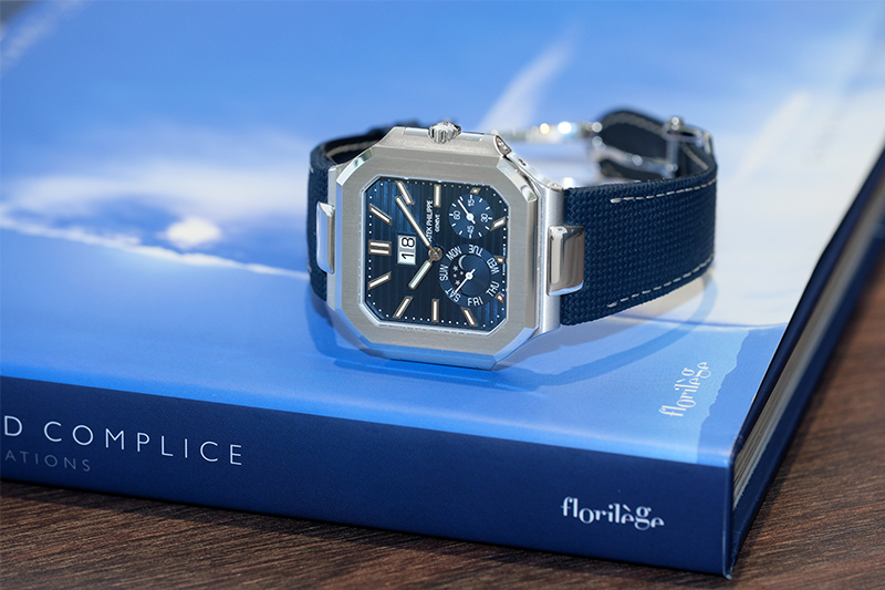 Patek Philippe launched the Cubitus collection with three models. Ref. 5821/1A features a stainless steel case and bracelet with an olive-green dial. Ref. 5821/21AR combines stainless steel and rose gold with a blue dial. The top model, Ref. 5822P-001, introduces a new grand date complication alongside day and moon phase displays on a blue dial in a platinum case – this is worn on a navy blue composite strap with a fabric pattern. All three models measure 45mm in diameter. The three-hand models have a case thickness of 8.3mm, while the grand date model, with its additional functions, is only slightly thicker at 9.6mm, thanks to its use of an ultra-thin movement with a micro rotor as the base caliber.