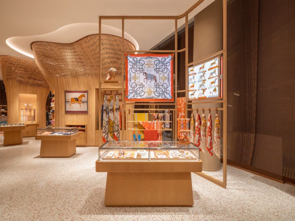 The boutique also features curated artworks from the Émile Hermès collection and Hermès’ contemporary photography collection, including the series “Nocturne 3” by French photographer Marie Joubert. Another highlight is the twin horses sculpture of rattan and metal, evoking the sense of horses ascending a staircase. It was created by Thai designer Terawat Teankaprasith who previously designed the “Masan & Masan” silk scarf motif for the brand.