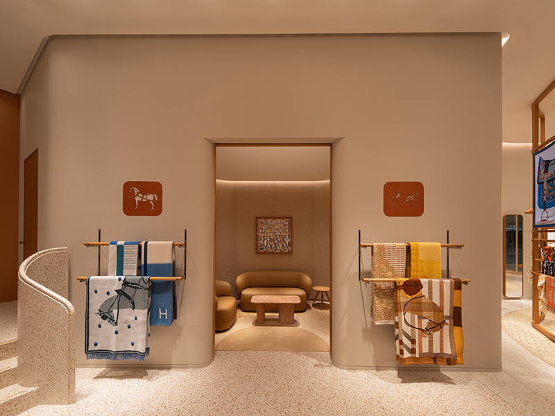 From the exterior, the boutique is distinguished by a striking bamboo façade that stretches from the floor of the lower level to the ceiling of the upper level, filtering natural light and offering a sense of privacy. Upon entering, guests are welcomed by meticulously arranged cream and beige-toned Faubourg mosaic tiles. The interior is thoughtfully designed to showcase products from Hermès’ 16 métiers such as beauty and fragrance, silk accessories for women, fashion jewelry, home décor, equestrian goods, and, leather goods. A terracotta terrazzo staircase ascends to the upper floor, where ready-to-wear collections for both men and women, alongside men’s silk accessories, footwear, fine jewelry, and timepieces, await discovery.