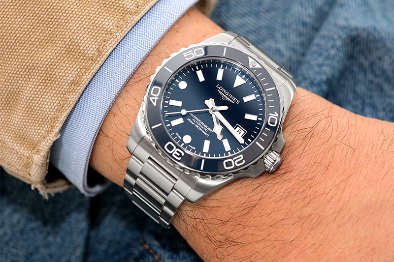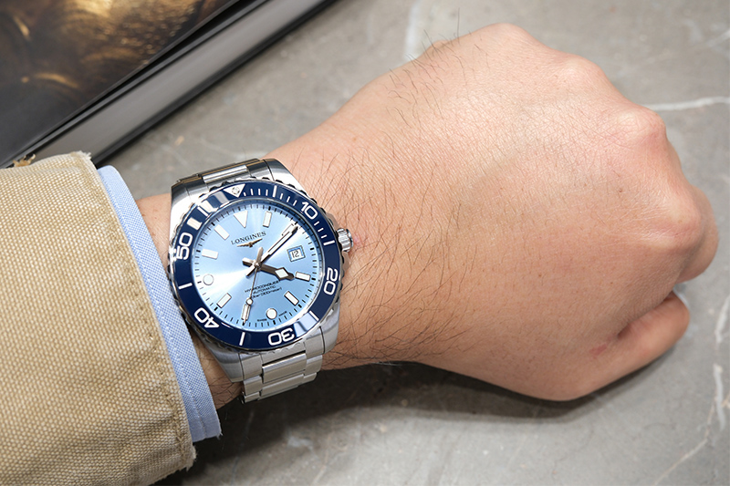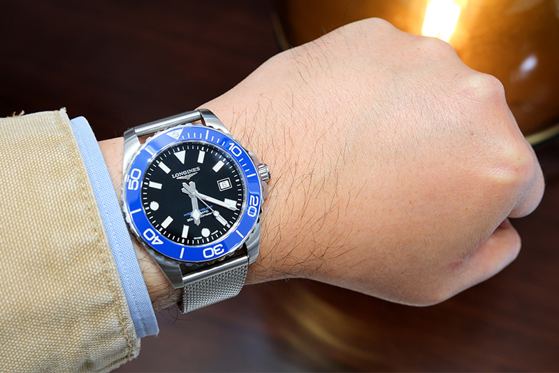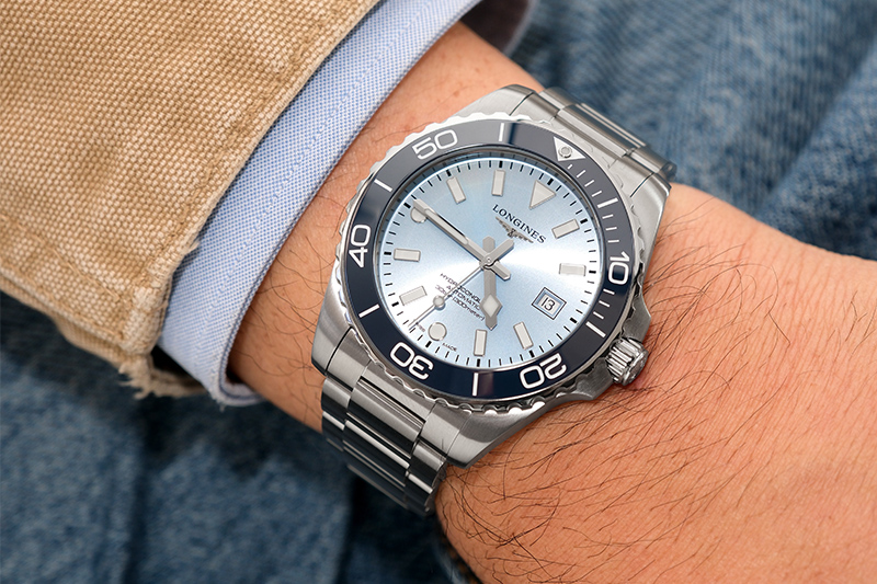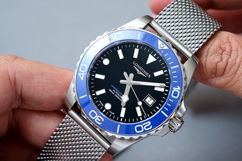 Certain dial design elements distinguish the 2026 HydroConquest differs clearly from the 2018 version. The hour markers no longer feature Arabic numerals at 12, 6 and 9, while the remaining markers, previously circular, have been changed to rectangular shapes, giving the watch a sharper appearance. Another noticeable update is the smaller crown, which results in slimmer crown guards. Altogether, these refinements make the new HydroConquest more suitable for pairing with business attire, particularly in the standard bracelet configuration. The mesh bracelet versions, meanwhile, retains an unapologetically casual character.