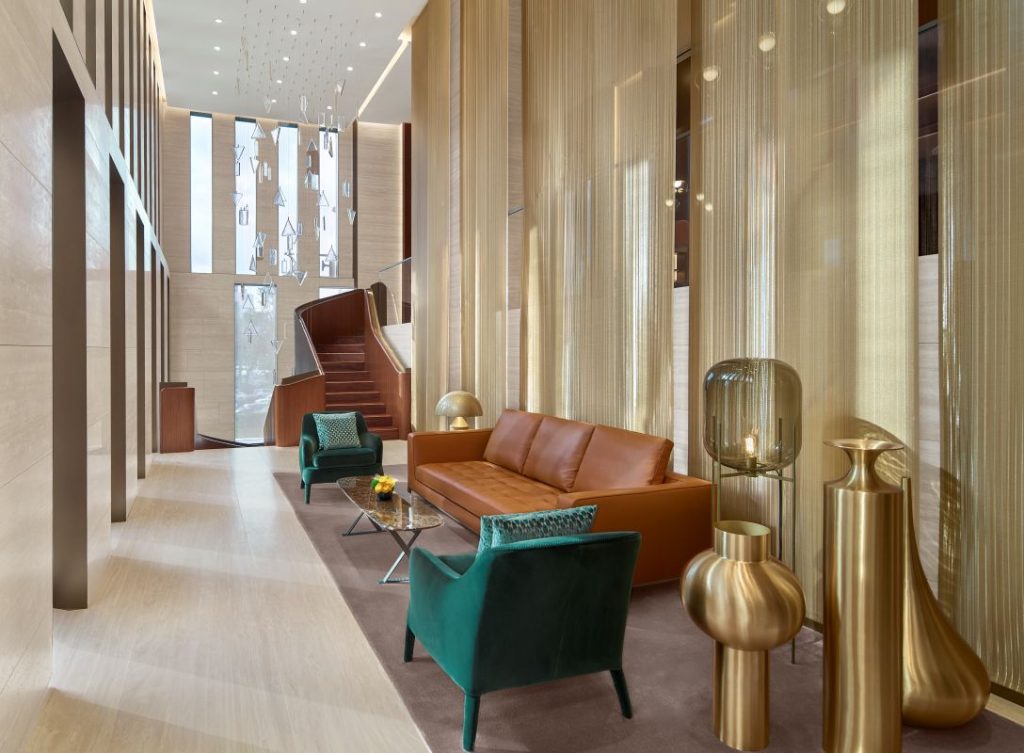 Every element of the interior reflects Rolex’s aesthetic codes. The brand’s elevated status radiates through carefully selected colour palette and materials of the furnishings, decorative motifs, and distinctive architectural features. The design also draws inspiration from Rolex’s iconic elements, such as the fluted bezel, reinterpreted as a facade pattern on the exterior and on the wall of the entrance hall which is clad in Verde Alpi green marble. Other interesting pieces to note include Jubilee bracelet-inspired lighting above the entrance counter; a chandelier inspired by hour markers on a dial that is suspended over the spiral staircase adorned with wood and gold-toned metal; and, pendant lights above the bar that echo the Cyclops lens.