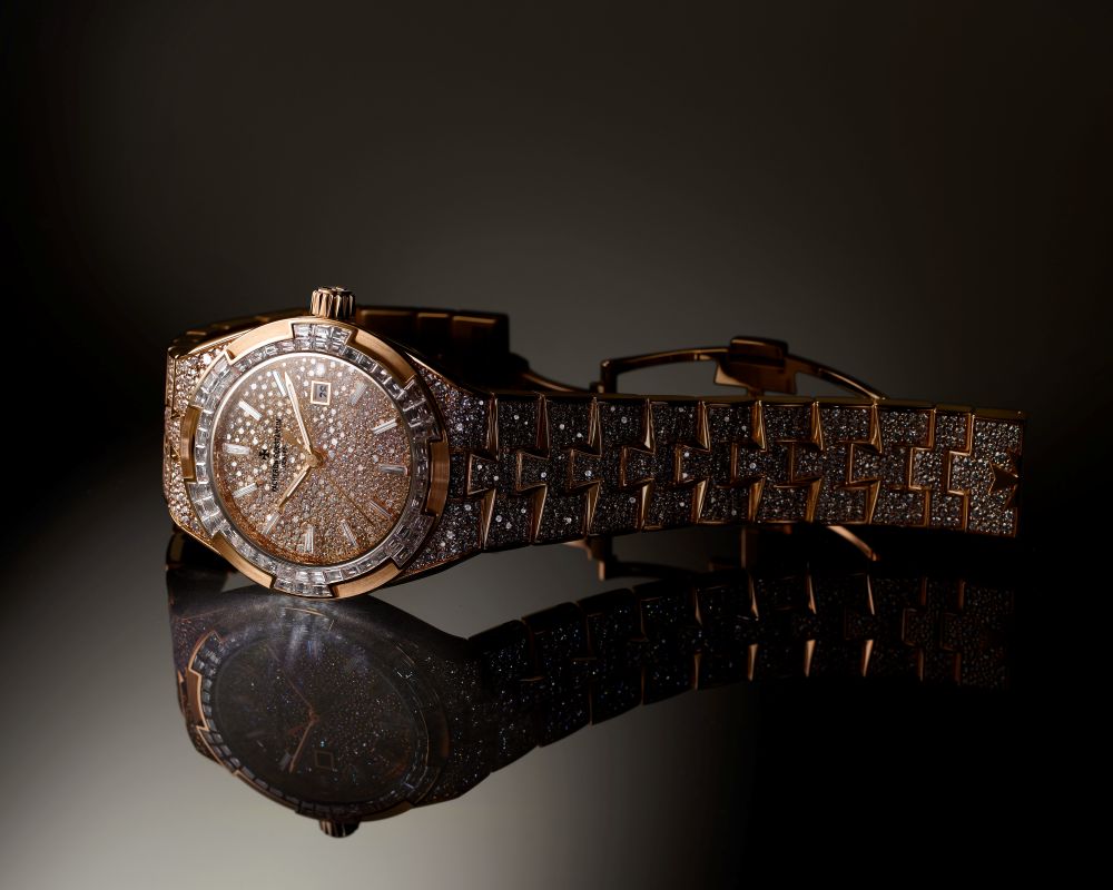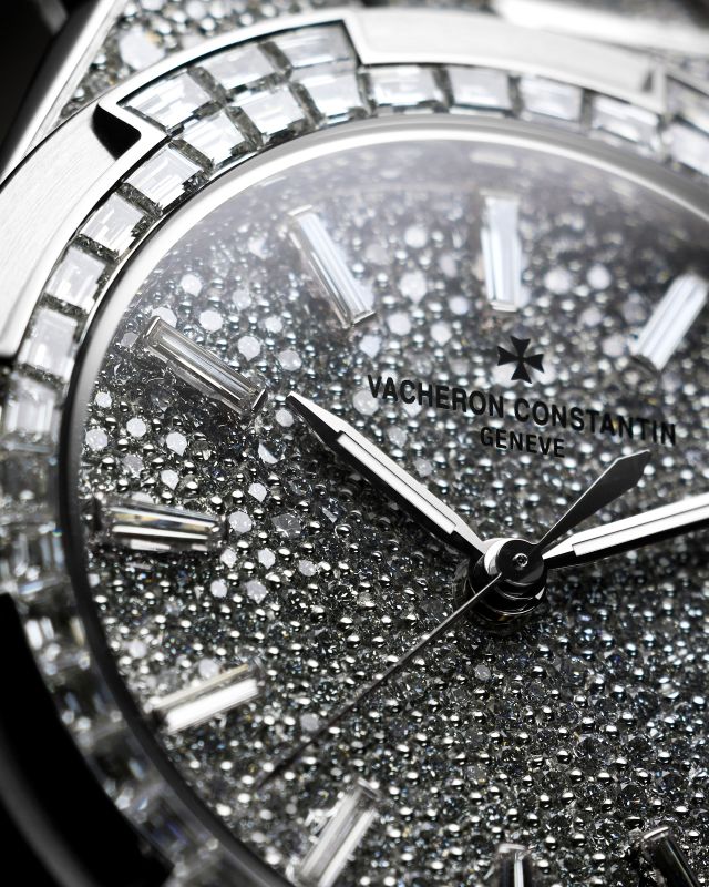 หน้าปัดของ Overseas รุ่นนี้มีเพชรทรงบริลเลียนท์คัทขนาดน้อยใหญ่จำนวน 314 เม็ด ตัดด้วยหลักชั่วโมงที่เป็นเพชรทรงบาแก็ตคัทจำนวน 12 เม็ดเพื่อความชัดเจน ล้อมรอบด้วยขอบตัวเรือนประดับเพชรทรงบาแก็ตคัทจำนวน 60 เม็ดอย่างน่าเกรงขาม แล้วยังมีเพชรทรงบริลเลียนท์คัทอีก 98 เม็ดบนขาตัวเรือนและอีก 884 เม็ดบนพื้นผิวด้านบนของข้อสายตลอดทั้งเส้น หากนับรวมเพชรทรงบริลเลียนท์คัทอีก 62 เม็ดบนหัวเข็มขัดของสายหนังและสายยางก็จะมีเพชรรวมทั้งสิ้น 1,430 เม็ดเป็นน้ำหนักถึงประมาณ 12.58 กะรัตเลยทีเดียว