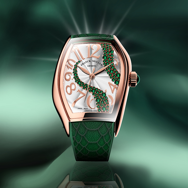 Franck Muller โชว์ลีลาการออกแบบนาฬิกาปีงูได้น่าประทับใจ พร้อมเผยโฉมตัวเรือนรูปทรงใหม่ที่มีชื่อว่า Silhouette CX ซึ่งพัฒนาต่อเนื่องจาก Curvex CX เดิมด้วยดีไซน์แบบอสมมาตรที่โค้งออกเว้าเข้าสลับกันทางด้านซ้ายและขวา และหน้าปัดตลอดจนแซฟไฟร์คริสตอลก็ต้องมีรูปทรงเดียวกันตามไปด้วย สำหรับ Silhouette CX Snake ที่ผลิตเป็นจำนวนจำกัด 28 เรือนนี้มีการประดับเอเมอรอลด์สีเขียวเข้มขนาดน้อยใหญ่จำนวน 78 เม็ดเป็นลวดลายเกล็ดงูที่เลื้อยพาดผ่านหน้าปัดอย่างเป็นธรรมชาติ สวมใส่ด้วยสายหนังลูกวัวสีเขียวพิมพ์ลายเกล็ดงูดูแปลกตา ทำให้ผลงานรุ่นนี้เป็นนาฬิกาปีงูที่ผู้คนจะจดจำได้ไปอีกนาน