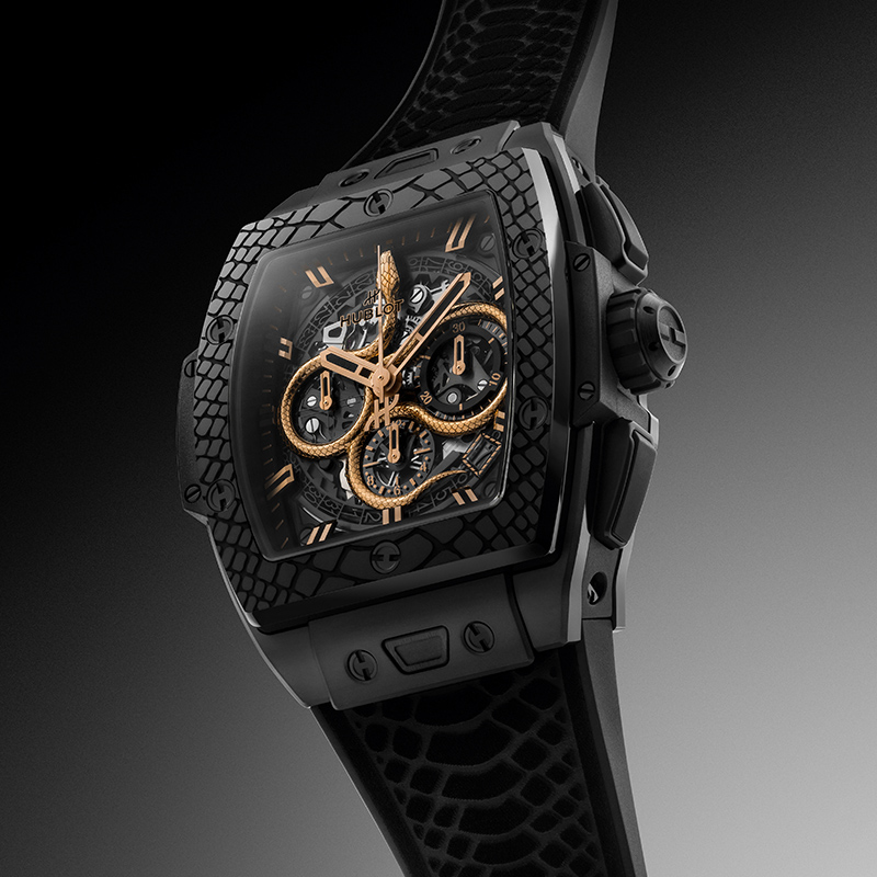 Hublot เลือกคอลเลคชั่น Spirit of Big Bang มาสะท้อนมนต์เสน่ห์ที่ลึกลับ น่าค้นหาของปีนักษัตรปีนี้ด้วยตัวเรือนเซรามิคสีดำพ่นทรายและขัดเงาขนาด 42 มม. พร้อมขอบตัวเรือนเซรามิกแกะสลักลวดลายเกล็ดงู แล้วยังสะกดทุกสายตาด้วยงูแกะสลักทองที่ดูสมจริงดุจเคลื่อนไหวอยู่รอบวงต่างๆ บนหน้าปัดคริสตอลแซฟไฟร์ Spirit of Big Bang Year of the Snake รุ่นนี้ทำงานด้วยเครื่องนาฬิกาขึ้นลานอัตโนมัติแบบสเกเลตั้นรุ่น HUB4700 สวมใส่สบายด้วยสายยางสีดำลวดลายผิวงู และผลิตจำนวนจำกัดเพียง 88 เรือน