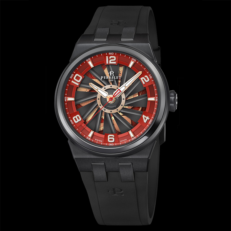 Perrelet หยิบเอาคอลเลคชั่น Turbine อันโด่งดังและเป็นเอกลักษณ์ของแบรนด์มาร่วมฉลองปีงู โดยเพิ่มเสน่ห์และความน่าค้นหาให้กับเรือนเวลารุ่นนี้ด้วยรูปงูสามมิติชุบทองที่ทำท่าเหมือนขดเลื้อยไปมาอยู่บนพื้นหน้าปัดแลคเกอร์สีแดงสด พร้อมแต่งแต้มอักษรจีนสีทองที่สื่อถึงความโชคดีและความมั่งคั่ง โดยหน้าปัดรูปงูนี้ถูกซ่อนอยู่ใต้ใบพัดที่จะหมุนตามจังหวะการเคลื่อนไหวของข้อมือ ยิ่งการหมุนของใบพัดนั้นเร็วเท่าใด รูปงูที่ซ่อนอยู่ก็จะปรากฏให้เห็นเด่นชัดมากขึ้นเท่านั้น Perrelet Turbine Snake รุ่นนี้มีตัวเรือนไทเทเนียมขนาด 41 มม. ที่เคลือบดำด้วยกระบวนการดีแอลซี และทำงานด้วยเครื่องนาฬิกาแบบขึ้นลานอัตโนมัติแบบอินเฮาส์รุ่นคาลิเบอร์ P-331-MH และจำกัดจำนวนการผลิตเพียง 88 เรือนเท่านั้น