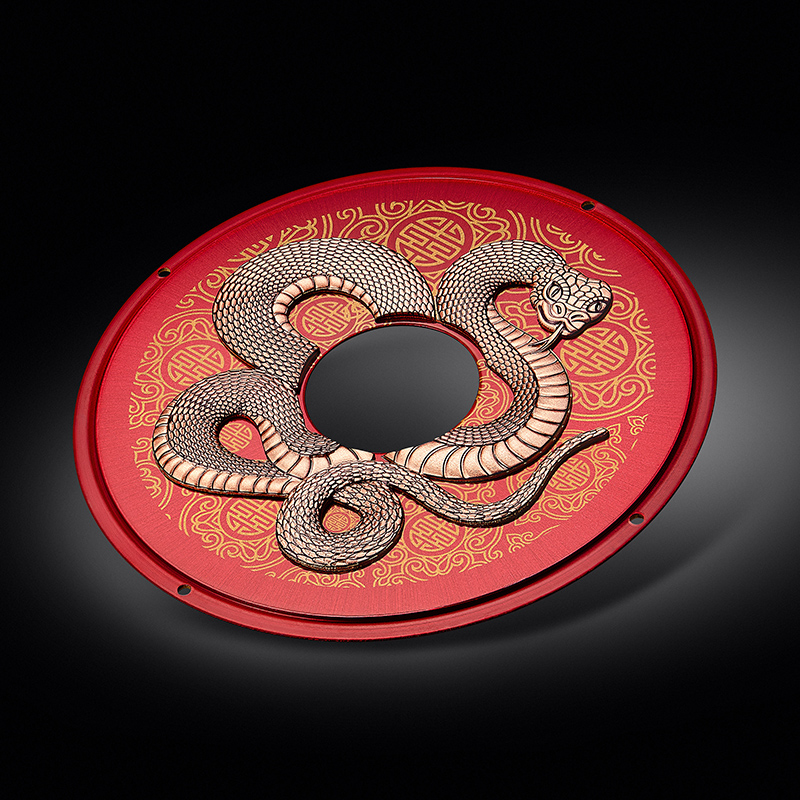 Perrelet celebrates the Year of the Snake with its signature Turbine collection, adding an element of mystery and dynamism. The dial features a three-dimensional gold-plated snake coiled over a striking red lacquered background, accompanied by golden Chinese characters for luck and prosperity. This design is concealed beneath a turbine rotor, which spins with wrist movement, gradually revealing the snake as the rotation speeds up. Limited to 88 pieces, the Turbine Snake is housed in a 41 mm black DLC-coated titanium case and runs on the in-house Calibre P-331-MH self-winding movement.