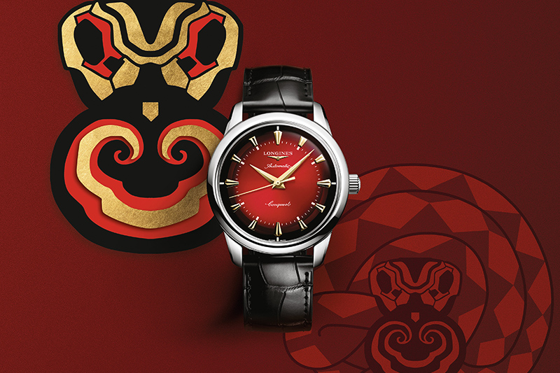 ทางด้าน Longines ก็มีนาฬิกา Conquest Heritage Year of The Snake ซึ่งผลิตเป็นจำนวนจำกัด 2,025 เรือนด้วยตัวเรือนสเตนเลสสตีลขนาด 40 มม. หน้าปัดทรงโดมไล่เฉดสีแดงสดใส ตัดด้วยหลักชั่วโมงและเข็มบอกเวลาสีทองดูเลอค่า ฝาหลังมีลวดลายงูคาบเห็ดหลินจือที่ออกแบบโดยศิลปินชาวจีนชื่อดัง หวู่ เจี้ยนอัน นาฬิการุ่นนี้ทำงานด้วยเครื่องแบบขึ้นลานอัตโนมัติรุ่นคาลิเบอร์ L888.5 ซึ่งมีซิลิคอนบาลานซ์สปริงเพื่อความทนทานต่ออิทธิพลของสนามแม่เหล็ก และมีกำลังลานสำรองสูงถึง 72 ชั่วโมง