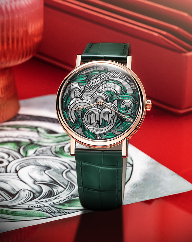 ผลงานนาฬิกาปีงูของ Breguet มีชื่อว่า Classique 7145 Lunar New Year 2025 และผลิตเป็นจำนวนจำกัดเพียง 8 เรือนเท่านั้น บนหน้าปัดที่ผสมผสานหลายเทคนิคงานศิลป์ ทั้งการแกะสลักรูปงูบนหน้าปัดด้วยมือ การลงสีเขียวแบบโปร่งแสงตามตำแหน่งที่เป็นใบไม้ และการตกแต่งพื้นผิวที่เป็นฉากหลังด้วยลวดลายกิโยเช่ต่างๆ ตัวเรือนเป็นโรสโกลด์ขนาด 40 มม. ที่ใส่ได้ทุกคนด้วยสายหนังจระเข้สีเขียวพร้อมหัวเข็มขัดวัสดุเดียวกันกับตัวเรือน Classique 7145 รุ่นนี้ทำงานด้วยเครื่องนาฬิกาแบบขึ้นลานอัตโนมัติรุ่นคาลิเบอร์ 502.3 ที่มีโรเตอร์ทอง 22 กะรัตและมีกำลังลานสำรอง 45 ชั่วโมง
