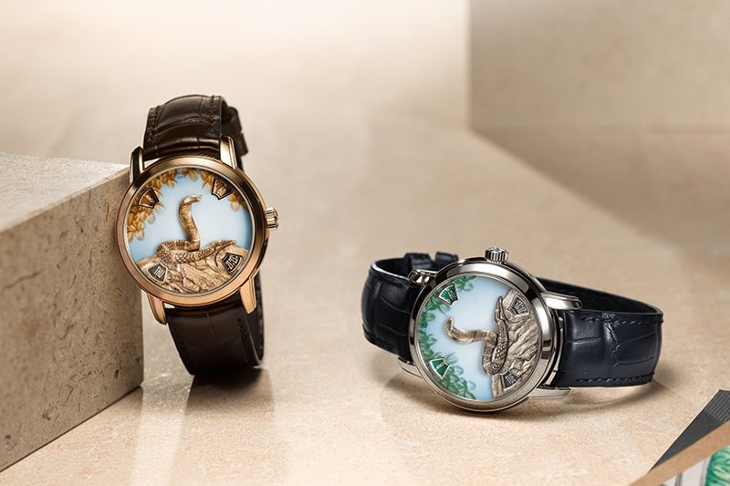 Vacheron Constantin Métiers d’Art The Legend of the Chinese Zodiac – Year of the Snake น่าจะเป็นนาฬิกาปีงูที่มีชื่อยาวที่สุดแล้ว เรือนเวลาดีไซน์แปลกตาขนาด 40 มม. รุ่นนี้แสดงค่าชั่วโมง นาที วันที่และวันด้วยระบบจานหมุนในหน้าต่างทั้ง 4 ทำให้พื้นที่ตรงกลางหน้าปัดไม่มีเข็มมาบดบังลวดลายอะไรก็ตามที่ต้องการจะรังสรรค์ขึ้นมา ช่างฝีมือของ Vacheron Constantin จึงใช้เวลานานถึง 3 วันในการแกะสลักทองจนเป็นรูปงูเห่าที่ดูสมจริงและรูปพื้นหินที่อยู่ด้านล่างมาประดับไว้บนหน้าปัดที่ผ่านกระบวนการวาดภาพท้องฟ้าและแมกไม้ด้วยเทคนิคกร็องเฟอเอนาเมลซึ่งช่วยขับให้รูปงูแกะสลักนั้นโดดเด่นยิ่งขึ้นไปอีก สำหรับนาฬิกาปีงูในครั้งนี้ Vacheron Constantin มีการผลิตเป็นรุ่นวัสดุพิงค์โกลด์และแพลทตินัมอย่างละ 25 เรือน