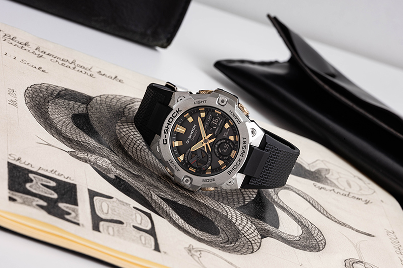 แต่หากคุณต้องการนาฬิกาปีงูในงบประมาณที่ไม่สูงนัก Casio ก็มี G-Shock GST-B400CX-1A เป็นผลงานลิมิเต็ดเอดิชั่นในไลน์ G-Steel ที่ออกแบบมาเพื่อรับกับปีงูโดยเฉพาะด้วยลวดลายเกล็ดงูบริเวณปุ่มกดสีทองและแถบที่คาดกลางหน้าปัด เมื่อพลิกมาทางด้านหลังจะพบกับลวดลายงูอูโรโบรอสขดตัวกินหางเป็นเครื่องหมายอินฟินิตี้ ตามความเชื่อของอียิปต์และกรีกโบราณสื่อถึงความไม่มีที่สิ้นสุดและความเป็นนิรันดร์ G-Shock รุ่นนี้ สวมใส่สบายด้วยสายเรซิ่นสีดำ